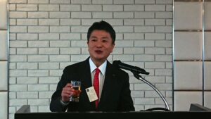 大山理事長の新年挨拶に続き、ご来賓の東北経済産業局 産業部長 古谷寿之<こや としゆき>様にご祝辞をいただき、株式会社宮城テレビ放送 代表取締役社長 山田克也様による乾杯の音頭で祝宴がスタートした。今回はご来賓・正会員社・賛助会員社117名が参加。